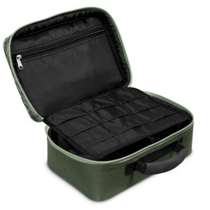 A Delphin TACKLE SPACE egy praktikus, párnázott táska C2G terepszínben, amelyet elsősorban kiegészítők tárolására terveztek. A fő tárolórészt egy párnázott tépőzáras elválasztó osztja fel, amely az Ön igényei szerint variálható. Szerelékes dobozok, súlyok, előkezsinórok és sok más előkekészítéshez szükséges kiegészítő tárolható benne. A középen található panel mindkét oldalon kis hálós zsebek találhatók, amelyek a horgok, forgók vagy egyéb tárgyak tárolására szolgálnak. A hálós anyagnak köszönhetően mindig gyorsan megtalálhatja a keresett tárgyakat.
